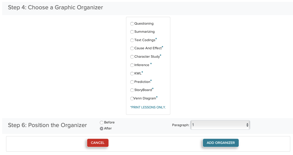 LessonWriter lets you choose the position any of the above graphic organizers anywhere in the reading: before, during or after specific paragraphs in a reading, allowing you to decide where your students need the most support.