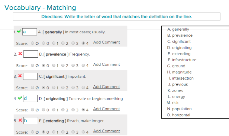 An example of LessonWriter’s scoring options for a matching exercise.
